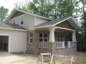 Residential Location: Jackson, Mississippi This house is one of a series of houses being designed and built for low income housing in Jackson. Four of these houses have been completed to date and are fully occupied. The idea with this, and a series of houses like it, is that it fit within the context of a 1920s Arts and Crafts housing stock remaining in the area, that it have great curb appeal, and that it be very economical to build. The main design feature is it is constructed of Structural Insulated Panel Systems or SIPs. This revolutionary building system creates an exoskeleton for a building rather than an interior skeleton like 2 x 4s. The factory cut 8’x24’ panels are delivered to the site with windows and door openings already prepared and the envelope of the house can be erected in a matter of days. It has much higher insulation value than typical stick construction, excellent long term environmental qualities and no wood framing system has better wind resistance characteristics. |